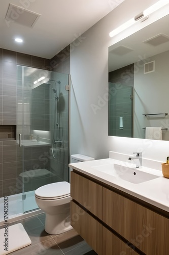 Modern bathroom interior with minimalist design. Ideal for architecture, real estate, and lifestyle concepts