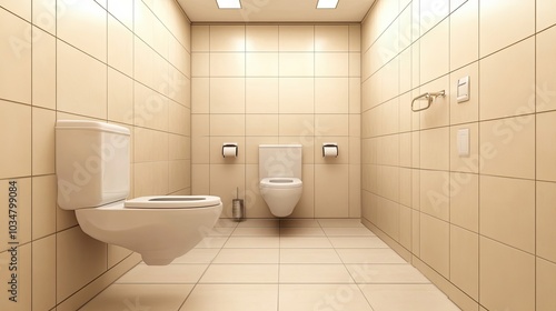 Modern Bathroom with Beige Tiled Walls and Two Toilets