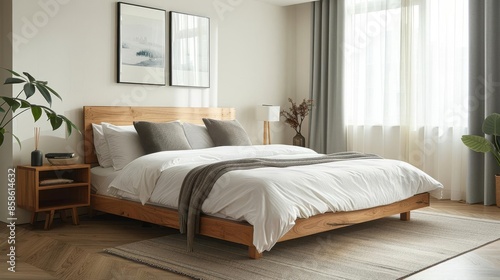 Modern Bedroom Decor - Light wood bed frame with white linens, grey throw pillows, a minimalist nightstand, and a simple lamp