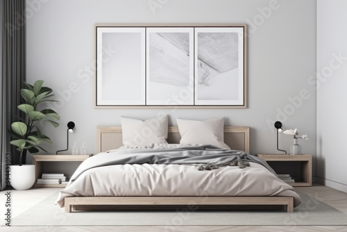 Modern bedroom decor with a white mockup frame on the wall and a comfortable bed, creating a perfect sleeping environment. AI Generative.