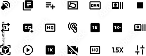 Modern black video player UI icons set on white background, including play button, audio file, resolution labels