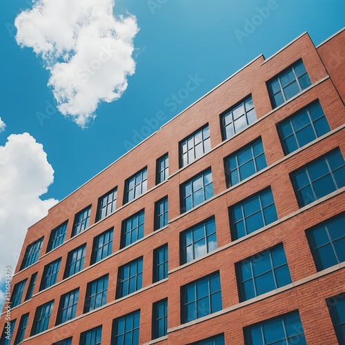 Modern Brick Building Exterior with Blue Windows and Cloudy Sky