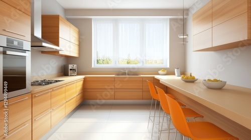 Modern Bright Kitchen with Wooden Cabinets and Orange Bar Stools