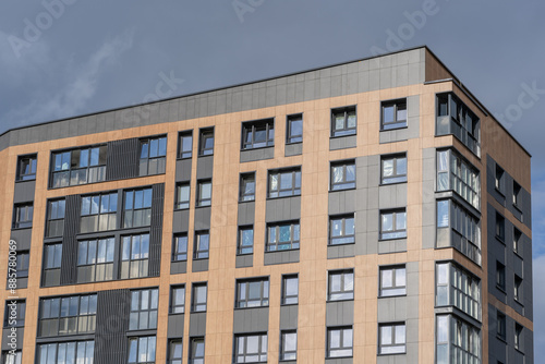 Modern brown building facade with shiny mirror windows against blue sky