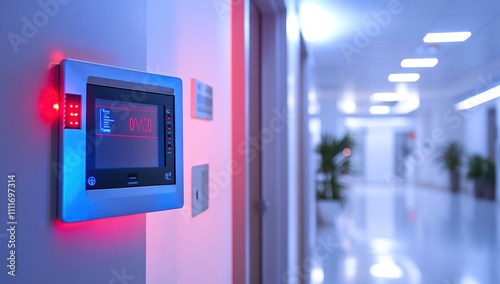 Modern Building's Digital Control Panel: Illuminated Interface Displays Data Efficiently in Corridor Setting.