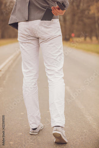 Modern business man holding cellphone in pocket.