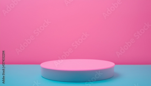 Modern circular podium in pink room. Empty pedestal. Product display. Mock-up.