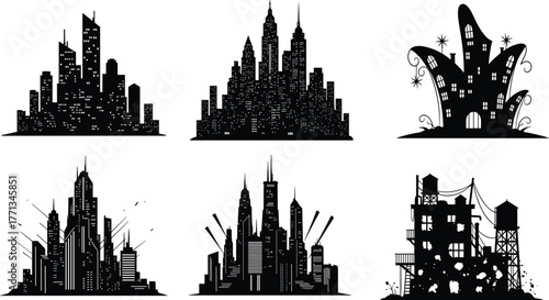Modern city skyline silhouettes collection, urban architecture design, futuristic and fantasy buildings, creative downtown skyscrapers, night cityscape vector illustration