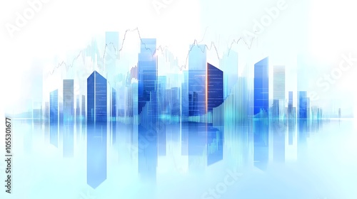Modern City Skyline with High-Rise Buildings and Transparent Blue Tones Featuring Minimalistic Data Graph Overlay, Highlighting Financial Growth Concept and Futuristic Architecture in Clean