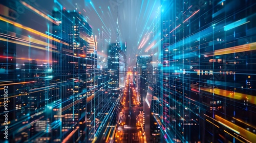 Modern city with towering skyscrapers and flowing cloud-based data streams between them