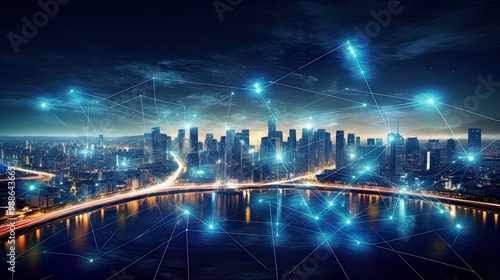 Modern city with wireless network connection and city scape concept.Wireless network and Connection technology concept with city background at night