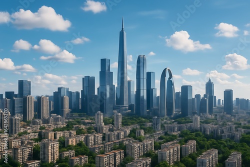 Modern cityscape with tall skyscrapers and dense residential buildings under a cloudy sky
