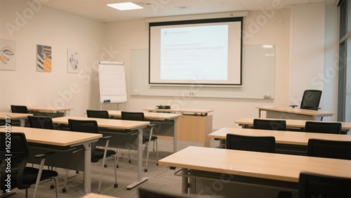 Modern Classroom Setup with Desks, Chairs, and Projection Screen