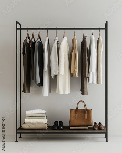 Modern clothes rack with assorted garments and accessories