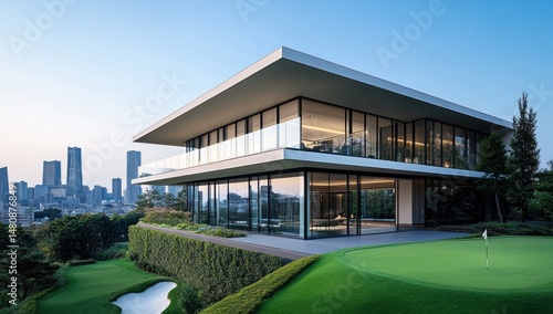 Modern clubhouse overlooking city golf course