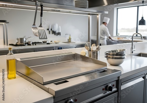 Modern Commercial Kitchen with Stainless Steel Appliances and Chef
