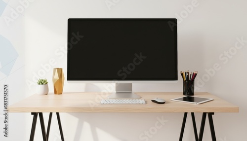 Modern computer monitor with a blank black screen sits prominently on a light wooden desk, surrounded by minimalist office accessories against a bright white wall