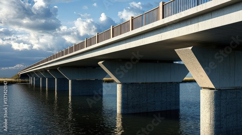 Modern concrete bridge spanning a serene waterway under a dramatic sky with clouds