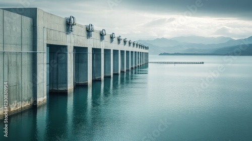 Modern Concrete Structure Over Calm Water with Mountains in Background