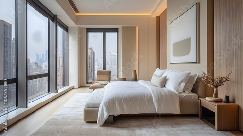Modern condo bedroom with minimalist design, soft textures, and a neutral color palette for a peaceful and stylish retreat.