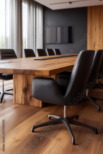 Modern conference room featuring a sleek wooden table and ergonomic black chairs, perfect for corporate meetings, presentations, or collaborative discussions, Enhance your workspace visuals,