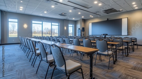 Modern conference room setup with rows of chairs and tables