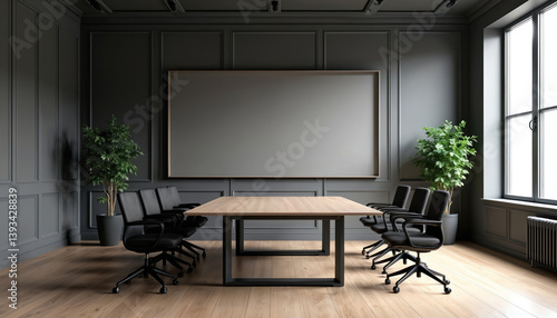 Modern conference room with empty poster mockup, wooden table, black chairs. Interior design for business meetings, presentations. Corporate office design space for business advertisement.