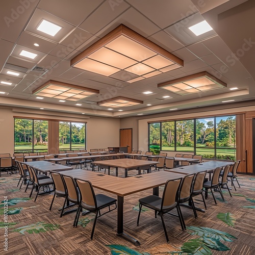 Modern conference room with large windows, u-shaped table arrangement, and tropical-themed carpet.