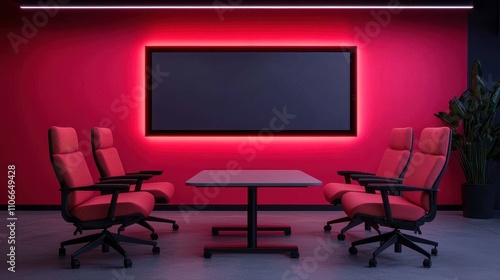 Modern Conference Room with Red Accent Wall and Ergonomic Chairs