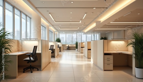 Modern corporate office with cubicles, stylish design, bright lighting. Open workspace with contemporary interior, working environment. Comfortable office, productivity. Business, workplace, business