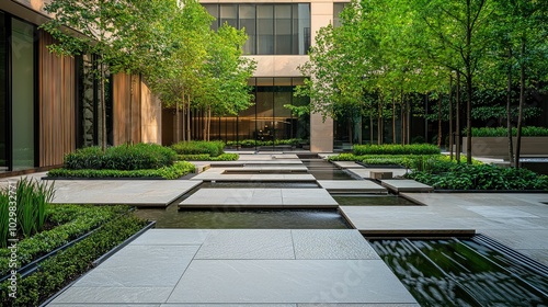 Modern Courtyard with Lush Greenery and Water Features