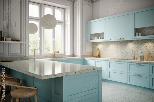 Modern cozy kitchen, classic clean interior design with blue, white and beige colors. Super photo realistic background, generative ai illustration