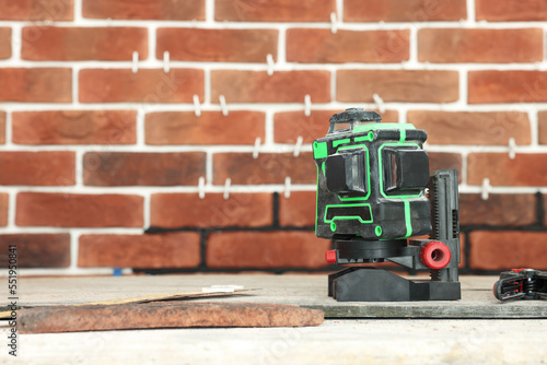 Modern cross line laser level on floor indoors, space for tex. Tiles installation process