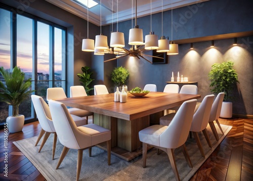 Modern dining room, drone view: sleek wooden table, white chairs, glowing candles, pendant light.