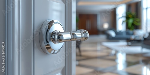Modern door handle on light interior. Blurred room and natural sunlight in the background. Closeup of front view with copy space