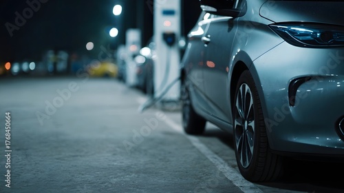 Modern electric cars connected to charging stations in a dimly lit parking lot at night representing sustainable future mobility