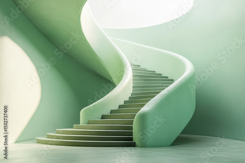 Modern elegant scene with curved two-level staircase structure in matte finish on pastel green gradient