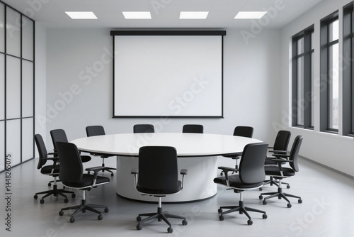 Modern empty conference room with a blank white screen on the wall and a round meeting table surrounded by comfortable chairs, creating a professional setting.