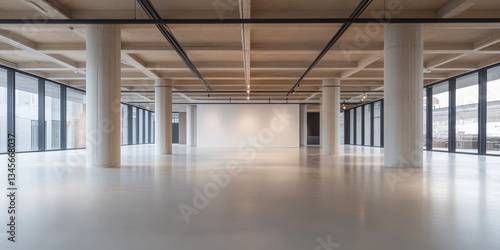 Modern empty interior space with large windows and natural light during daytime