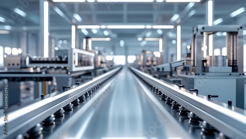 Modern Factory Conveyor System Gleaming Metal Reflecting Lights Industrial Production Line Efficiency Innovation Automation Technology