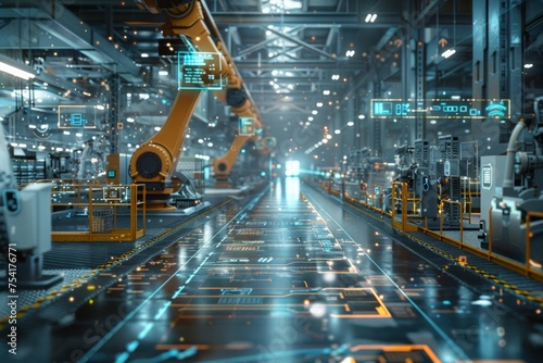 Modern factory interior with futuristic digital overlays