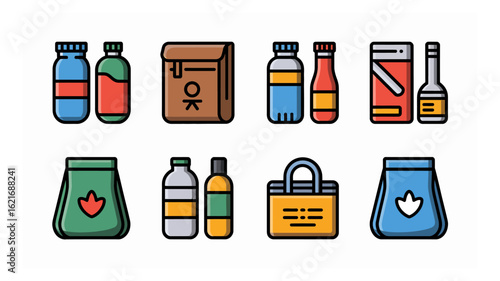 Modern flat design vector illustrations showcasing a diverse collection of food and beverage packaging, bottles, bags, and containers