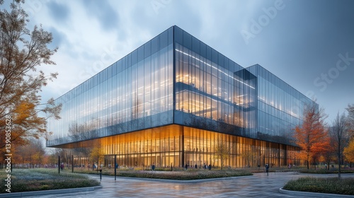Modern Glass Building with Illuminated Facade and Autumn Trees