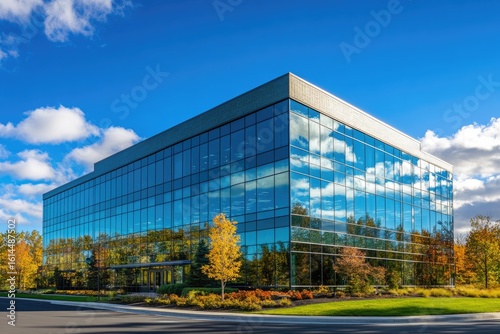 Modern glass office building on a sunny autumn day