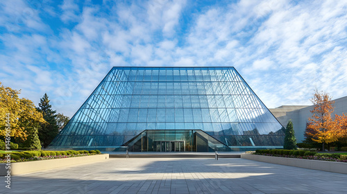 Modern Glass Pyramid Building Exterior with Blue Facade