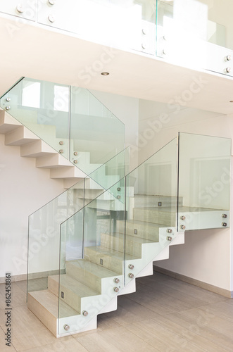 Modern glass staircase with metal accents in contemporary home interior design, copy space