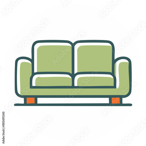 Modern green loveseat couch illustration, simple flat line art icon for interior design