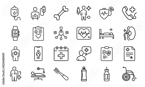 Modern Healthcare and Medical Line Icons – Patient Care, Hospital Equipment, Diagnosis Tools, Toothbrush, Prescription, Injection, and Medical Communication Symbols