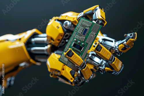 Modern High Tech Authentic Robot Arm Holding Contemporary Super Computer Processor. Industrial Robotic Manipulator End Effector Holding CPU Chip