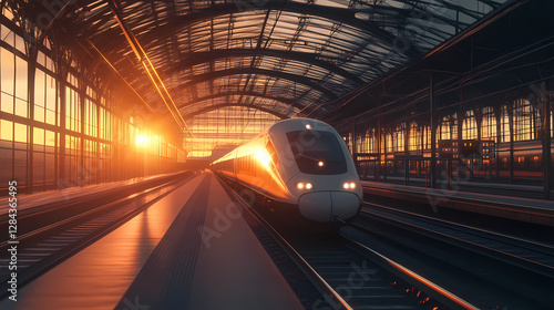 Modern high-speed train at a historic train station during sunset. Golden Hour Train Station. Illustration